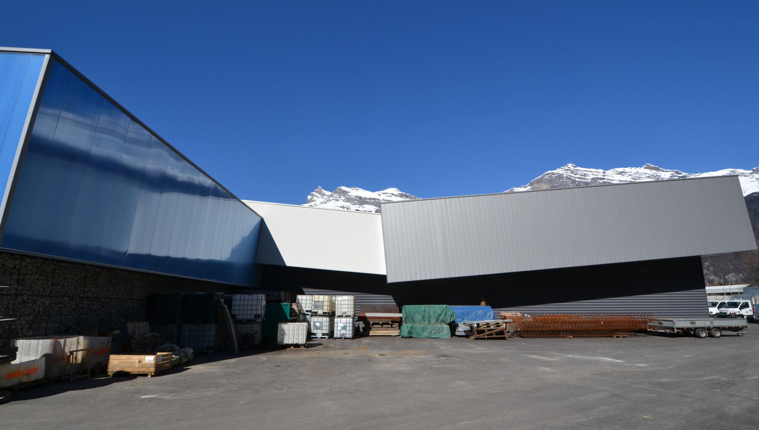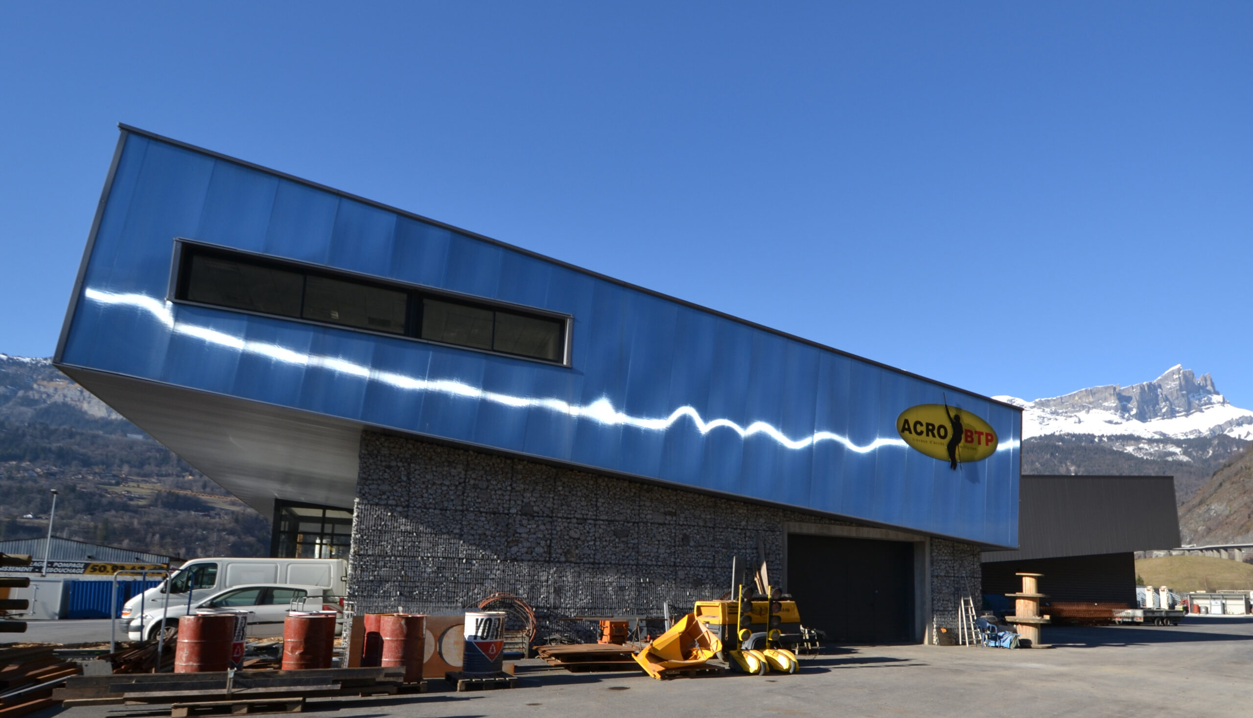 Le bâtiment se développe selon une logique simple et efficace. Un socle minéral en gabions ancre l’ensemble au sol et apporte une matérialité robuste, adaptée à un programme d’entreprise. Au-dessus, un volume métallique en porte-à-faux se déploie comme un ruban continu : il allège visuellement la masse du bâtiment, prolonge les lignes horizontales et crée une protection naturelle au droit des façades et des accès.