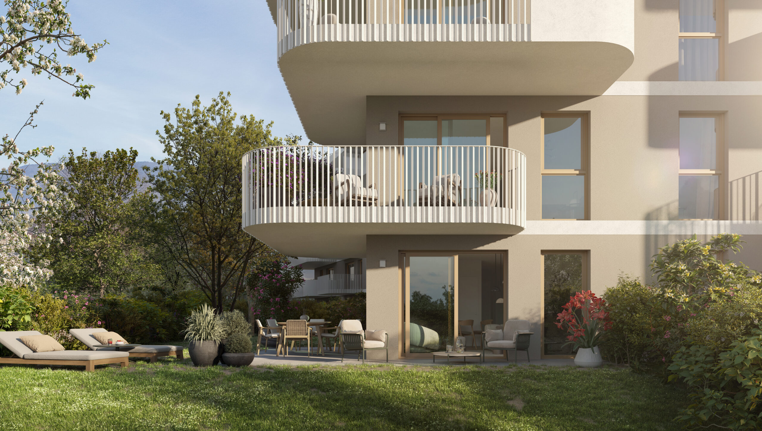 Le projet s’accompagne d’un traitement paysager soigné : plantations en pied d’immeuble, jardins et haies créent une transition douce avec l’espace public. Cette végétalisation contribue au confort des habitants, améliore la perception depuis la rue et participe à l’ambiance “résidentielle” recherchée dans une opération de logement collectif à Thonon-les-Bains.