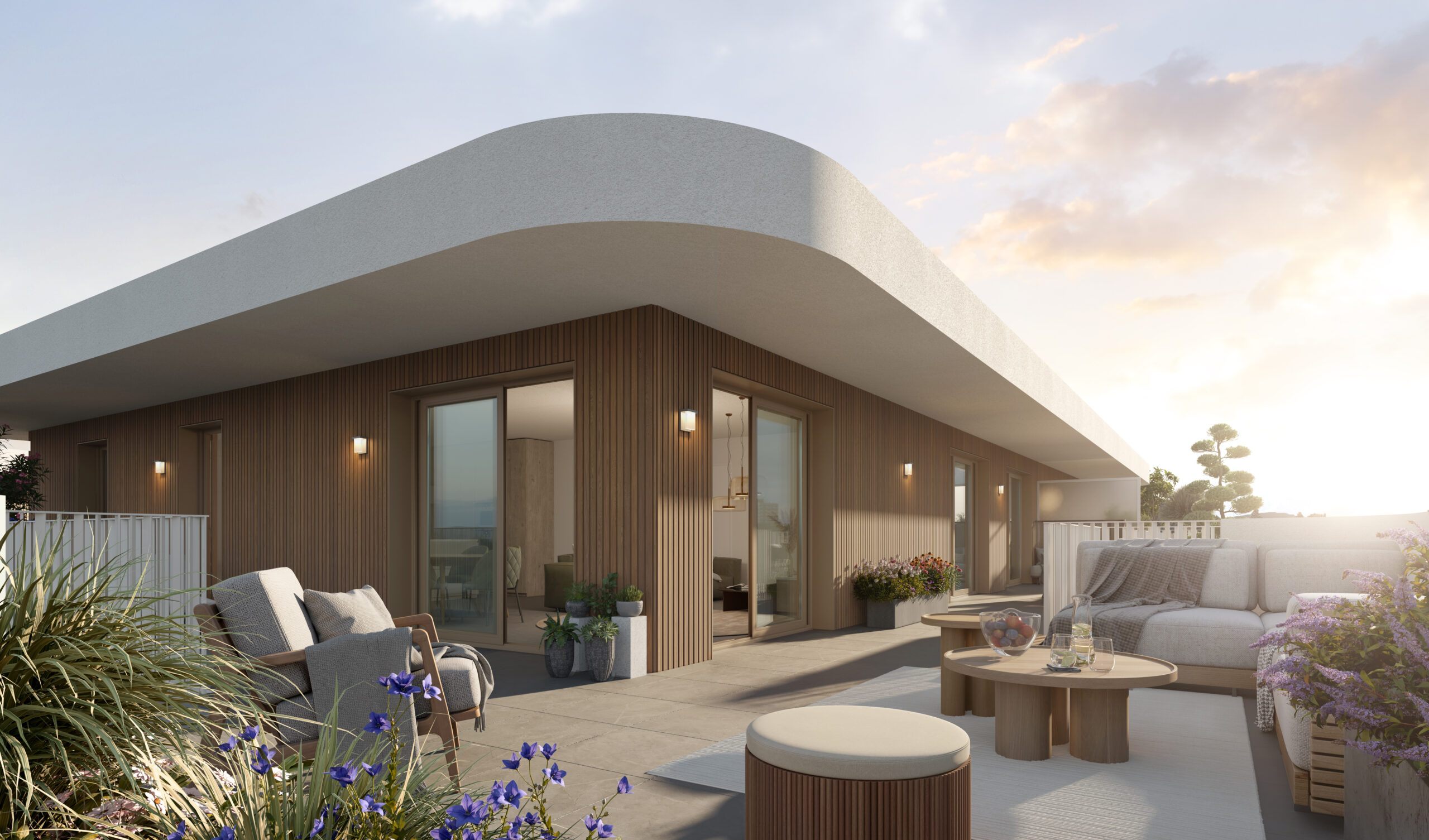 La résidence est rythmée par de grands balcons d’angle et des terrasses continues, véritables prolongements des appartements. Ces espaces extérieurs offrent des vues dégagées, améliorent l’ensoleillement et participent à la qualité d’usage au quotidien. Les garde-corps à barreaudage vertical créent un filtre élégant : ils préservent l’intimité tout en laissant passer la lumière.