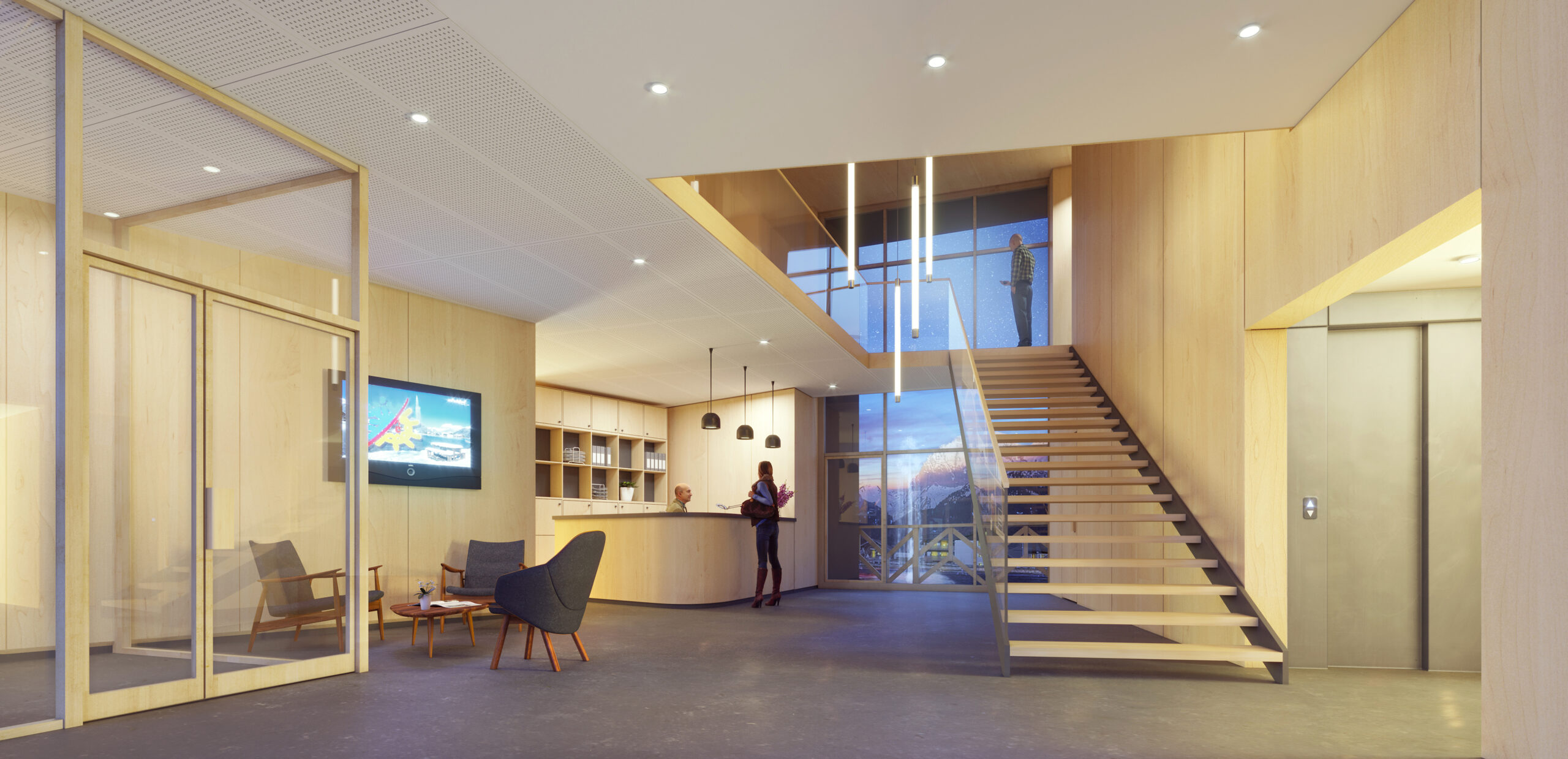 L’entrée est positionnée à l’angle de ces deux orientations : un point stratégique offrant une excellente visibilité depuis la RD22. Le hall, largement vitré, fonctionne comme une faille transparente : il propose une vue traversante vers le lac, le jet d’eau et les montagnes, dès l’arrivée sur le parvis.