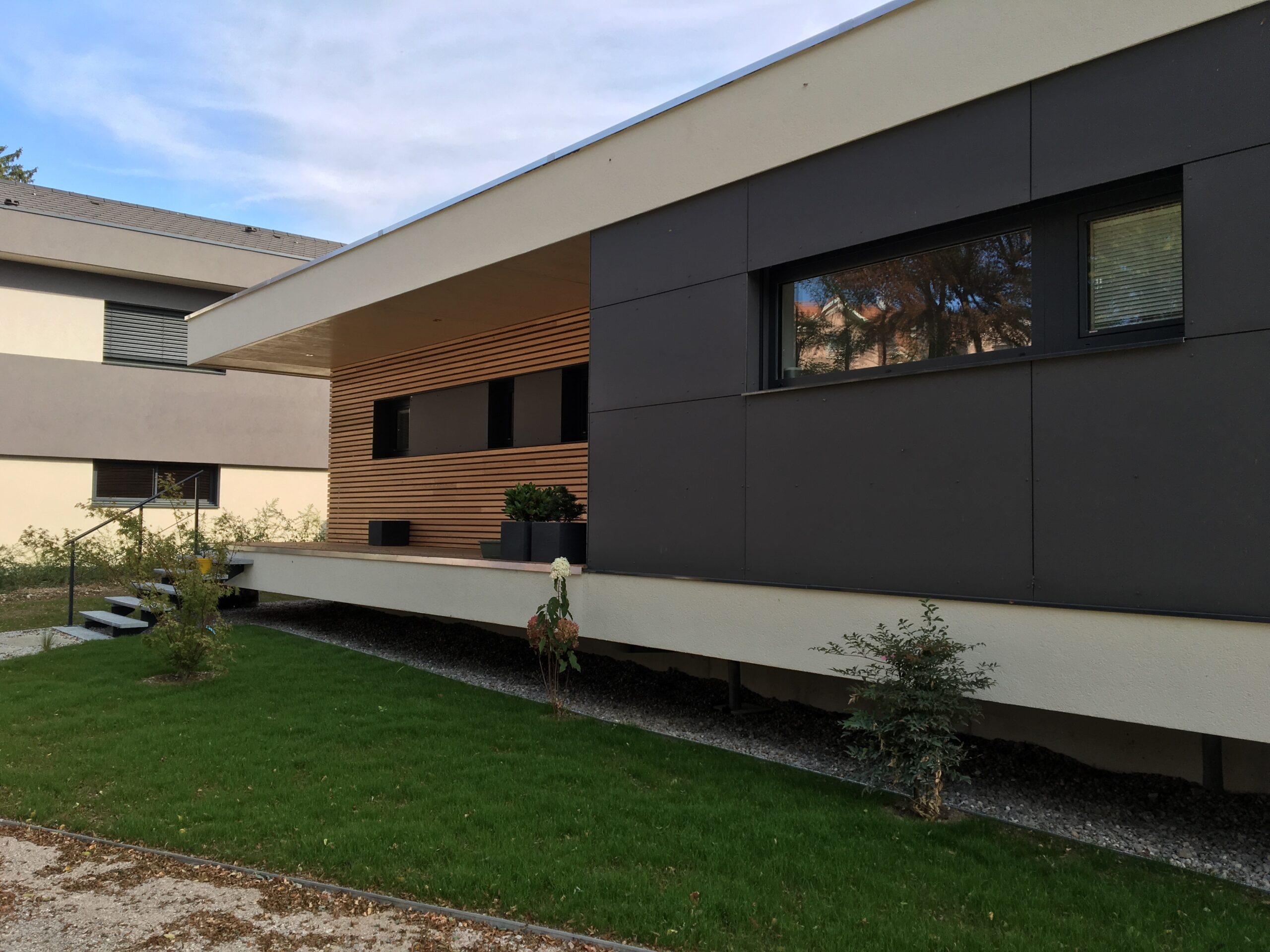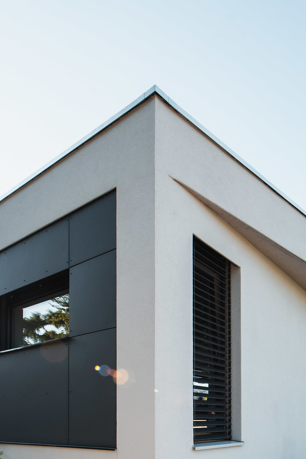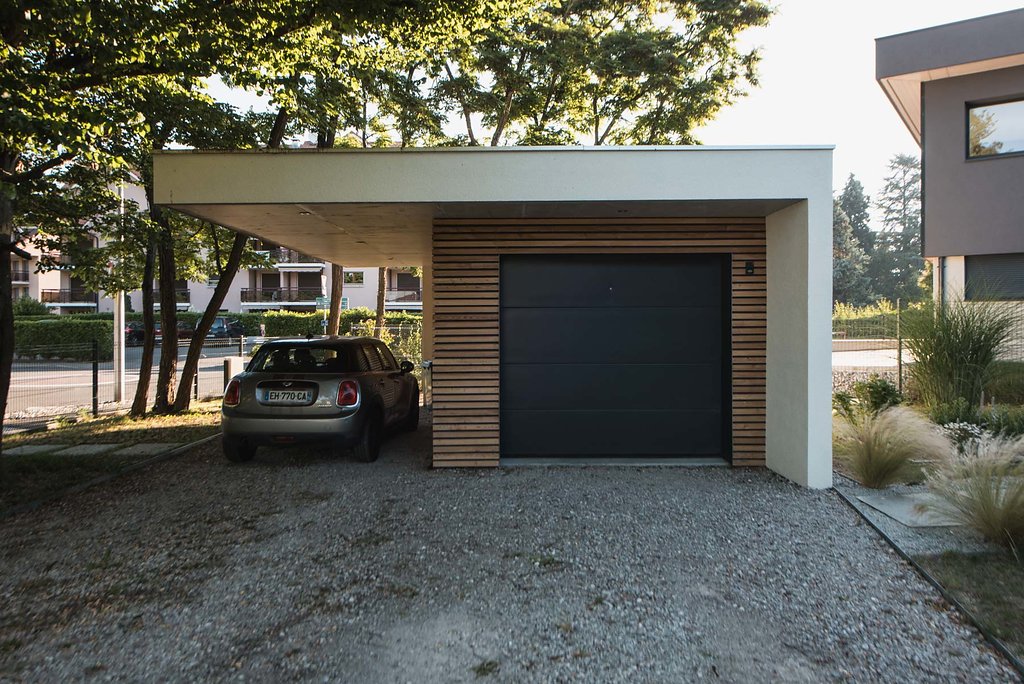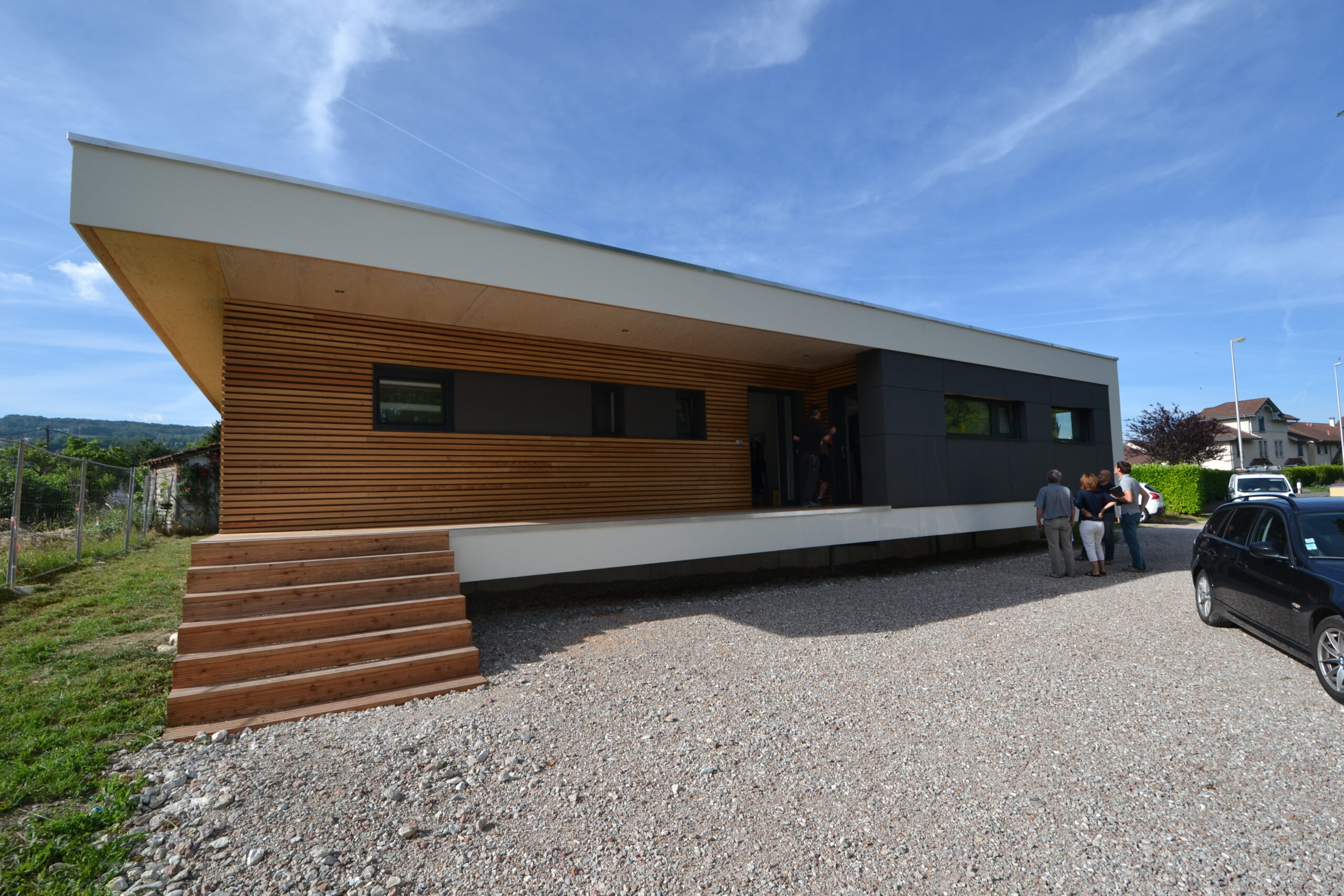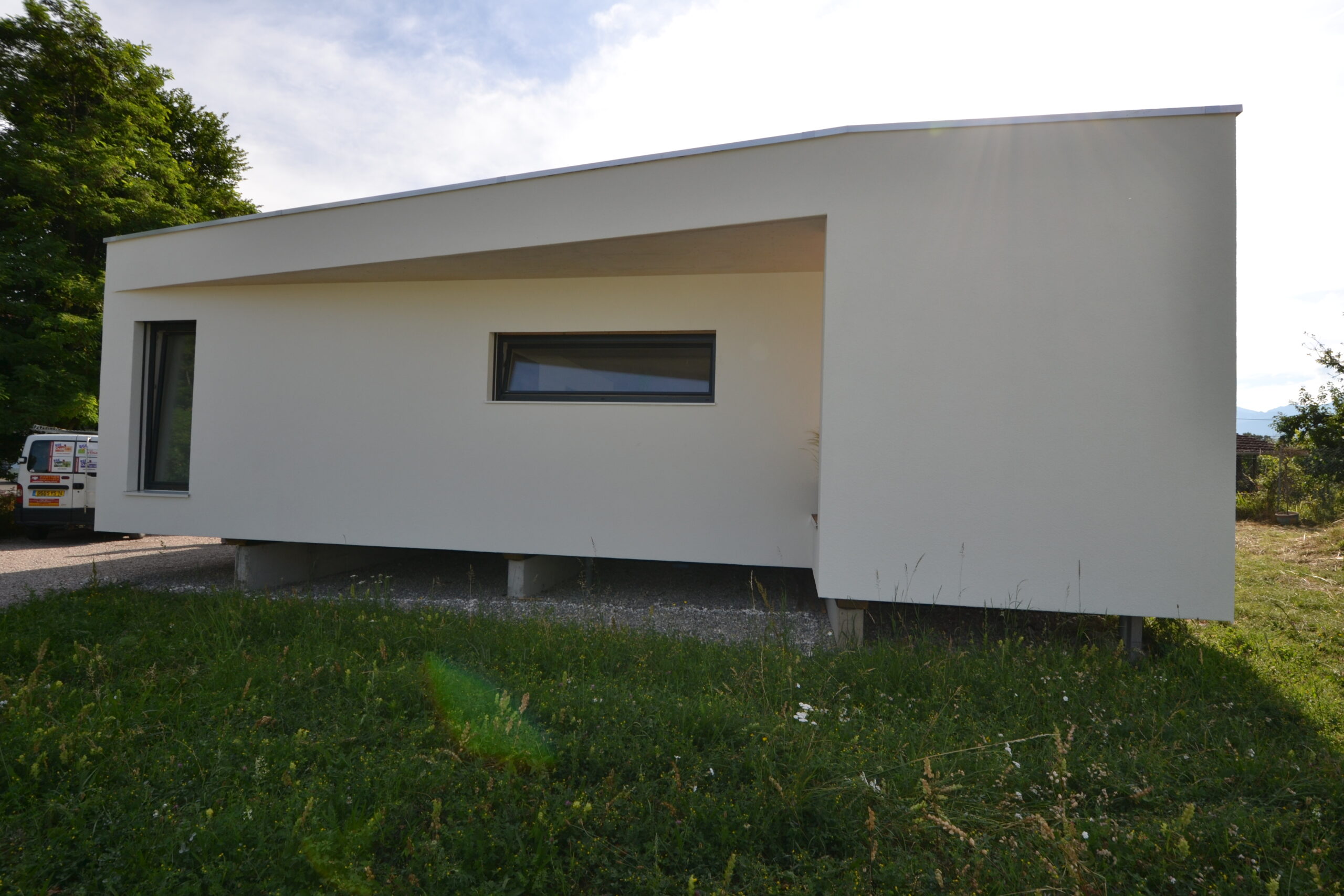 - Une silhouette minimaliste : toiture débordante et façade étirée.