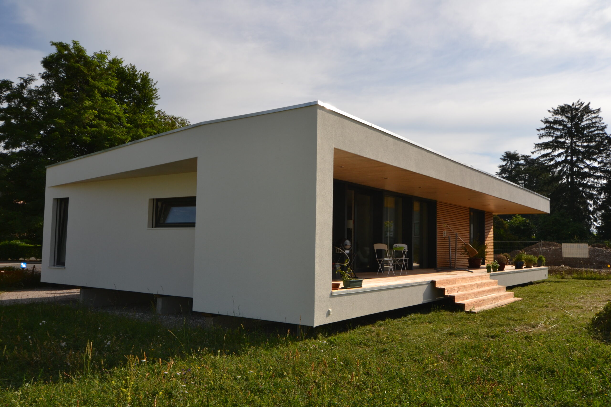 Le projet se caractérise par une toiture fine à grand débord, qui vient “poser” la maison dans le paysage. Cette casquette protège la façade, crée une ombre agréable sur la terrasse et donne au volume une présence élégante, presque flottante. La géométrie est volontairement simple : un seul niveau, un rectangle allongé, une composition calme et durable.