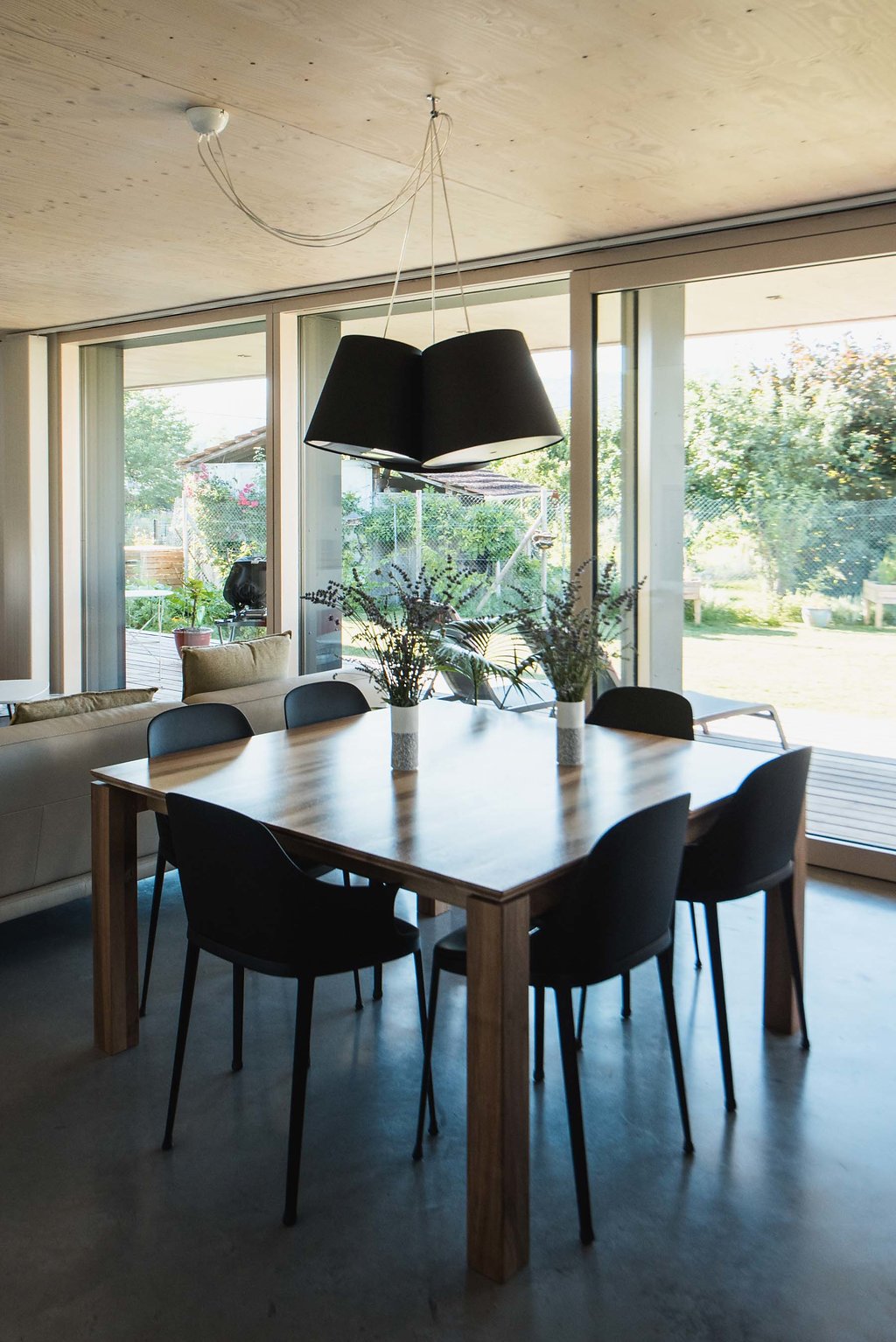 La maison s’ouvre largement grâce à de grandes baies vitrées orientées vers la terrasse. Le seuil disparaît : le séjour se prolonge naturellement sur un platelage extérieur, conçu comme une pièce supplémentaire dès les beaux jours. Cette continuité renforce la luminosité, facilite les usages familiaux et valorise un mode de vie tourné vers l’extérieur.