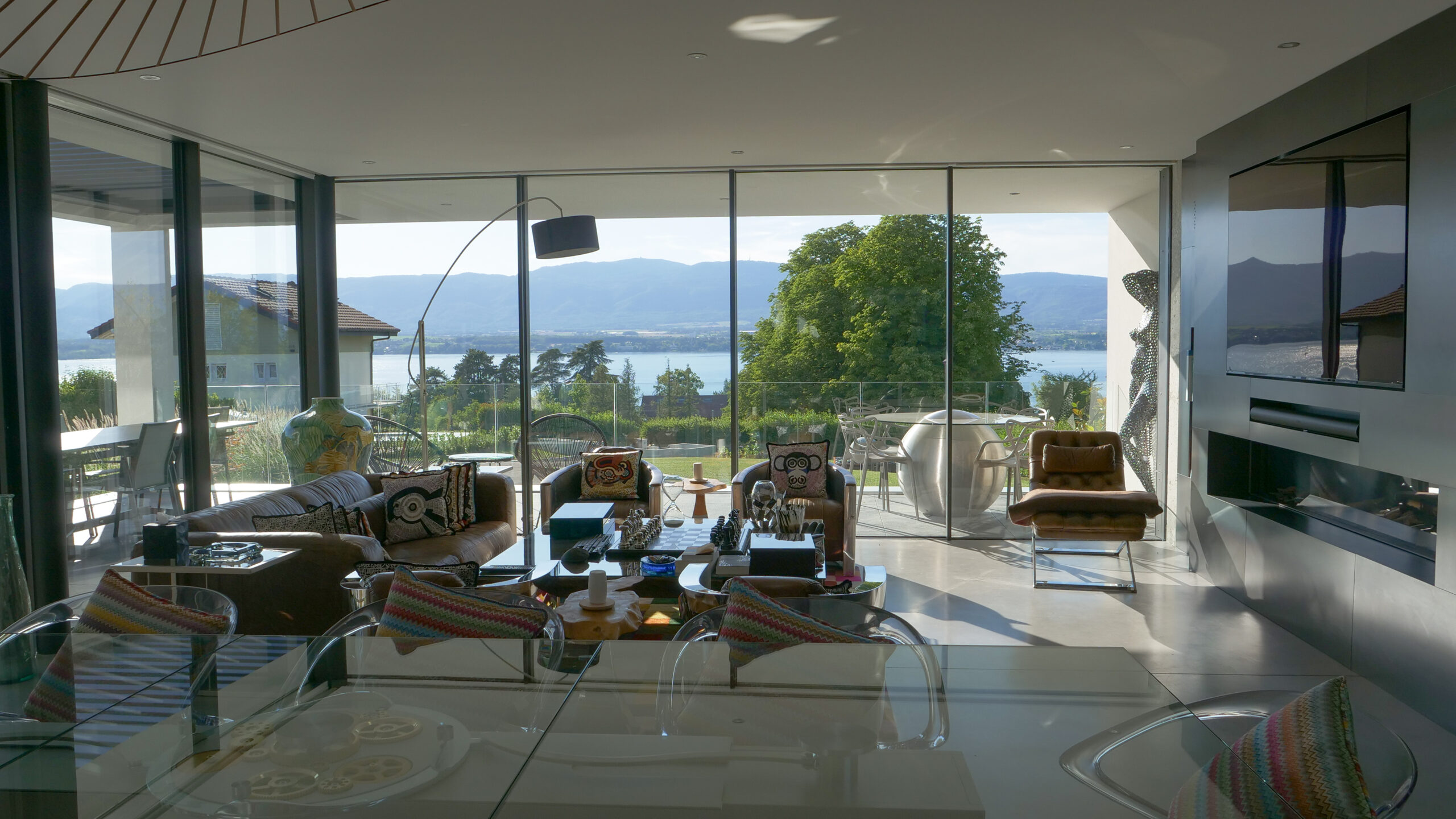 Au rez-de-chaussée, les pièces de vie s’ouvrent sur une vaste terrasse et sur une piscine orientée Nord-Ouest, conçue comme une extension naturelle du séjour. Positionnée pour profiter de la lumière de fin de journée, la zone baignade bénéficie elle aussi de la vue sur le lac Léman, transformant l’extérieur en véritable espace de réception et de détente.